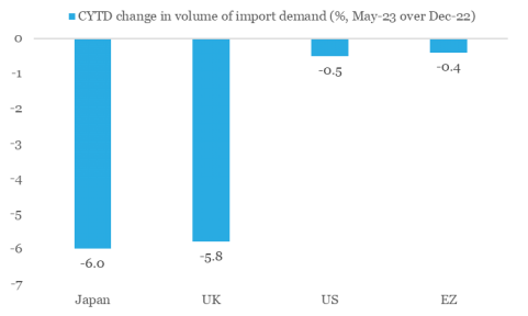 Global trade volume registered a contraction of 2.4% YoY in May-23. This marked the sixth annualized contraction in trade volume in seven months. Basis, UNCTAD’s nowcast model, we project global trade volume to see an average contraction of 0.9% in Jul-Sep 2023 quarter, marginally better than the estimated contraction of 1.3% during Apr-Jun 2023 quarter.
