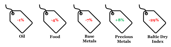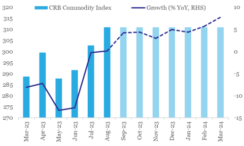 Chart 3: Recent pick-up in commodity prices if sustained, will push annualized growth in CRB index to positive territory