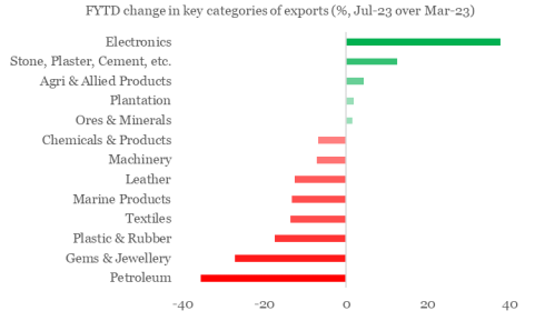 The commodity wise run rate for India’s exports shows a divergent behaviour, although the distribution is negatively skewed on a cumulative basis. For e.g., at one end is Electronics Items, which has outperformed others by posting a robust expansion 37.7% YoY (Apr-Jul FY24 over Apr-Jul FY23), while on the other end of the spectrum is Petroleum Products, which is proving to be a drag with 35.7% YoY contraction.