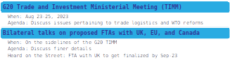 - Recent jump in global commodity prices, esp. crude oil, from an average of USD 75 pb in Jun-23 to USD 87 pb in Aug-23 (so far) would widen the trade deficit.
