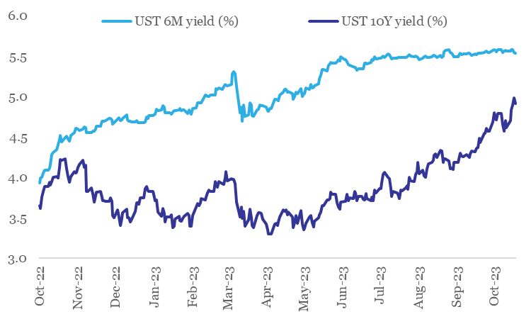 Since the Sep 20th Fed policy review meeting, there has been significant upward pressure on US yields. However, the pressure is concentrated at the mid-long tenor bonds, with short dated bonds remaining almost unfazed (between Sep 20th and Oct 20th, while the 10Y UST yield has jumped by 54 bps, 6M UST yield has seen a modest increase of 2 bps). We believe this to be an outcome of the following factors:
