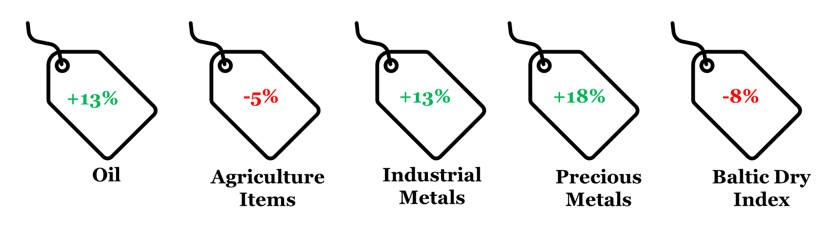 Note: (i) Price change is between Apr 19, 2024 and Dec 31, 2023; (ii) Oil price is represented by Brent; (iii) Agriculture Items, Industrial Metals, and Precious Metals are represented by respective Bloomberg Commodity indices; (iv) rounded off figures represented.