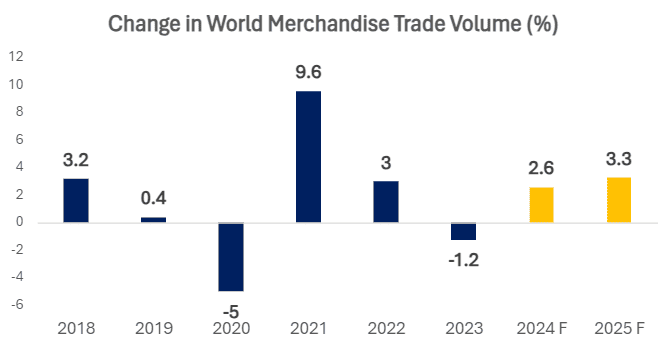 Note: Values for 2024 and 2025 are forecasts by the WTO