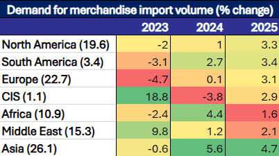 Table 1: Regional heatmap depicting growth in volume of merchandise import demand