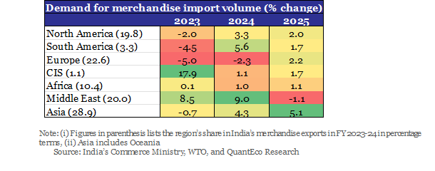 As per the WTO, growth in demand for imports on volume basis is expected to be the strongest for countries in Asia over 2024 and 2025. This is expected to be followed by countries in South America and North America. While the Middle East is expected to see strong demand in 2024, the same could peter out completely in 2025. Meanwhile, demand from Europe, CIS countries, and Africa is likely to remain subdued over 2024 as well as 2025.