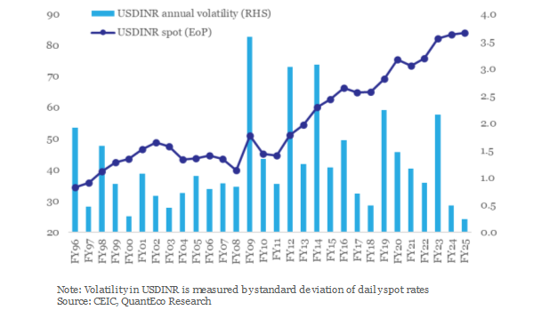 Despite the record weakness in the India rupee, the currency has seen extremely low levels of volatility. Relatively stable underlying macroeconomic balance characterized by high growth, moderate inflation, lower than trend trade deficit, correcting fiscal imbalances, and record high FX reserves bode well from the perspective of India’s global appeal and its currency stability.