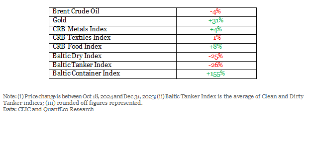 Global maritime trade cost presents a mixed picture in 2024 so far. At one end, the Baltic Dry Index and the Baltic Tanker Index is down ~28% and ~23% in 2024 so far, the Baltic Container Index is up by a whopping ~170%. Although maritime freight volume carried by containers is about 13%, their share in the value of maritime trade is high at around 66%. Hence, although the sharp rise in container freight cost this year is unlikely to have a meaningful impact on the volume of maritime trade, it is bound to impact its overall cost.