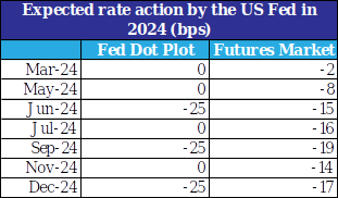 Note: Fed Dot Plot reflects the median expectation of rate cuts by Fed members (as of Dec-23)