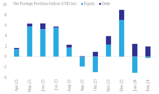 Chart 4: Post the announcement of India’s inclusion in JPM EM Bond Index in Sep-23, foreign debt inflow has picked up pace
