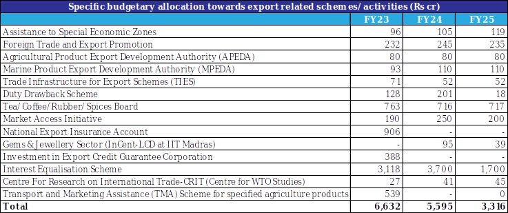 - Bulk of the contraction budgeted in 2024-25 is an account of lower allocation for Interest Equalisation and Duty Drawback Schemes