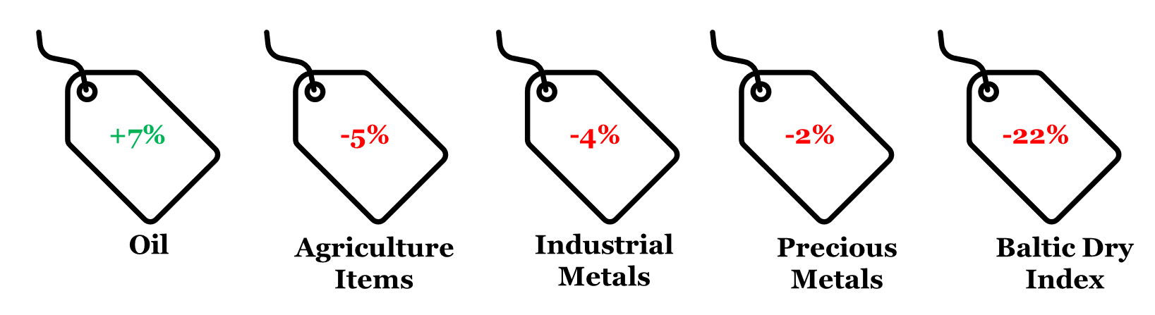 Note: (i) Price change is between Feb 20, 2024 and Dec 31, 2023; (ii) Oil price is represented by Brent; (iii) Agriculture Items, Industrial Metals, and Precious Metals are represented by respective Bloomberg Commodity indices; (iv) rounded off figures represented.