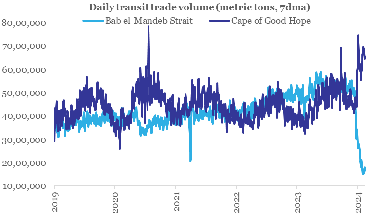 Note: The Red Sea region is a systemically important shipping lane that facilitates about 11% of global maritime trade. The key chokepoint lies around the Bab el-Mandeb Strait area, which in turn is connected to the Suez Canal, and is an important conduit for global maritime trade, connecting regions like Asia, Middle East, West & North Africa, Europe, and US East Coast. Most vessels are currently avoiding the Bab el-Mandeb Strait and opting for the longer route via the Cape of Good Hope.