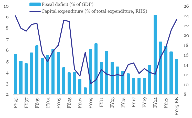 Chart 1: While fiscal deficit is set to reach its post pandemic low in 2024-25, allocation for capex is set to create a record multi-decade high