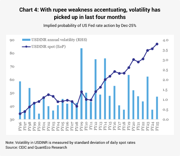 As far as the RBI is concerned, there now appears to be a somewhat greater tolerance for INR flexibility. While prima facie it would be difficult to ascribe a cause for the change in the central bank’s reaction function towards exchange rate management, a gradual build-up in INR overvaluation over last 3-quarters, decline in RBI’s FX import cover due to sizeable intervention since Oct-24, and a need for currency adjustment in a new global trade order could be possible reasons towards the same.