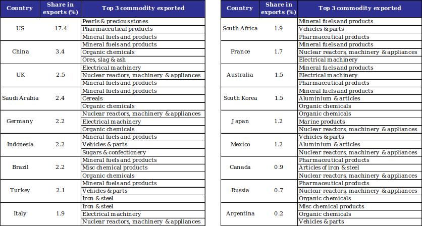 Nine items that dominate India’s exports with G20 partners: (i) Mineral fuels and products, (ii) Organic chemicals, (iii) Nuclear reactors, boilers, machinery & appliances, (iv) Electrical machinery, (v) Pharmaceutical products, (vi) Vehicles & parts, (vii) Iron & steel, (viii) Aluminium & articles, and (ix) Misc chemical products.Chart 2: Top commodity exported by India to G20 partners in FY23