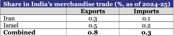 The simmering of geopolitical risk in the Middle East since the Israel-Hamas war in 2023 has weighed upon trade activity. India’s combined merchandise trade with Israel and Iran stood at just USD 5.4 bn in 2024-25, down from USD 8.4 bn in 2023-24. Key products involved in trade with both the nations include Cereals, Edible fruits & nuts, Gems & jewellery, Ceramic products, etc.