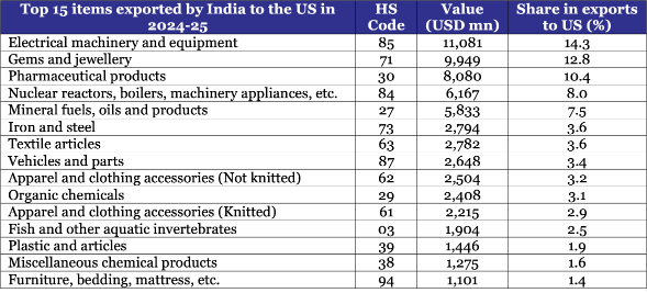 Of the total items exported by India to the US in 2024-25, the share of top 15 items (based on HS Code classification) constituted 80.2% in value terms, with Electrical equipment, Gems & jewellery, Pharmaceutical products, Machinery items, Textiles, and Iron & steel forming the bulk of the shipment.