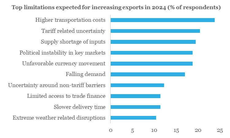 From 2024 perspective, the outlook on world merchandise trade (as enumerated by multilateral agencies like the IMF and the WTO) is moderately encouraging. Exporters surveyed by The Economist expect 2.3% increase in export volumes (goods + services) in 2024 compared to a subdued growth of 0.7% in 2023. Having said, the exporters echoed the uncertainty of the current global trade environment by highlighting veracious limitations for expansion (Top 10 limitations are illustrated below in Chart 2).