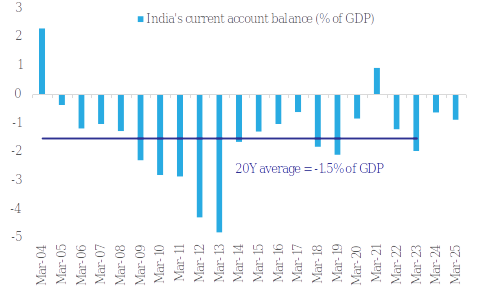 Chart 5: India’s FY24 current account deficit was narrower than its long term trend; likely to remain so in FY25