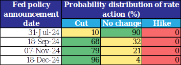 Along expected lines, the US Federal Reserve once again pushed back monetary easing expectations at its Jun-24 policy review. As per the latest projections by the Fed members, there is likely to be one rate cut before the end of 2024, down from the projection of two rate cuts predicted earlier in Mar-24.