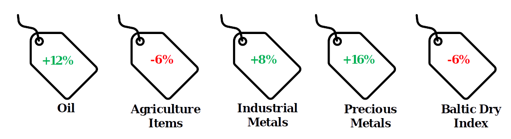 Note: (i) Price change is between Jun 24, 2024 and Dec 31, 2023; (ii) Oil price is represented by Brent; (iii) Agriculture Items, Industrial Metals, and Precious Metals are represented by respective Bloomberg Commodity indices; (iv) rounded off figures represented.