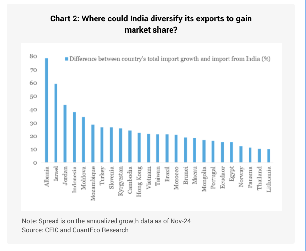 While record high price of precious metals may partly explain the bulge in India’s merchandise imports in 2024, we believe there is scope for improvement in India’s export performance. For example, the chart below illustrates the difference between the growth in individual country’s headline merchandise import vis-à-vis its import from India. Although the framework is simplistic and ignores the role of geopolitical, operational (like trade costs etc.), and structural factors (role of comparative advantage, etc.), it nevertheless shows the gap between the potential scope and actual performance for destination of India’s exports.