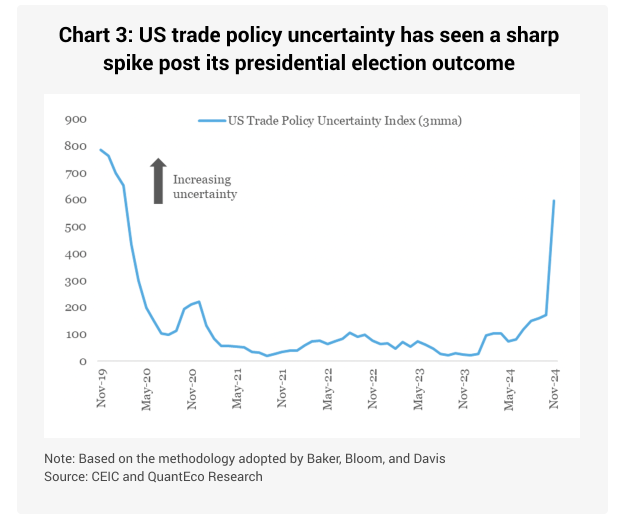 While there is heightened macro uncertainty on the prospects of global trade for 2025, there is also considerable micro uncertainty on the implementation of proposed tariffs by the incoming US administration. It is unclear if the proposed tariffs would have a list of exempted products, or whether the FTA partners would receive a preferential treatment. There is also a high possibility of retaliation from US trade partners as the proposed tariffs by the US administration could violate WTO and FTA commitments. The likely retaliation could take many forms, ranging from reciprocal tariffs to imposition of non-tariff measures, and incorporating currency adjustments.