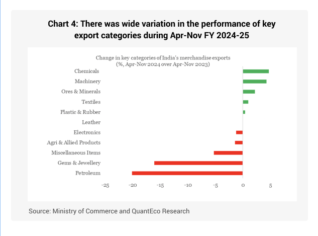 - o India’s merchandise exports depicted a broadly similar outturn, i.e., after contracting by 5.3% between Jan-Nov 2023, clocked a moderate recovery, expanding by 3.0% between Jan-Nov 2024.