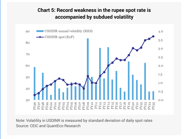 - Basis the RBI’s Real Effective Exchange Rate index (a trade weighted average exchange rate that adjusts for inflation differentials with the trading partner), the rupee is ~10% overvalued compared to the long period average. As such, any depreciation in the currency helps to correct for the inherent overvaluation.