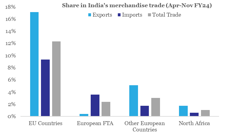- Europe and North Africa had a share of 17.8% and 1.1% in India’s total trade during Apr-Nov FY24 respectively. India had a larger share of merchandise exports (at 22.7%) going to Europe and North Africa (1.8%) compared to merchandise imports from Europe (14.7%) and North Africa (0.6%) respectively during Apr-Nov FY24.