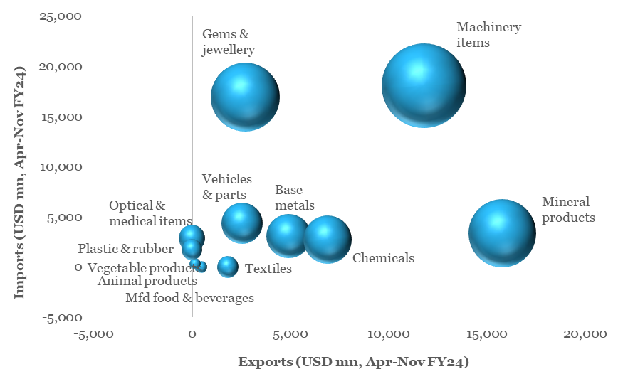 - Key goods traded include Machinery items, Gems & jewellery, Mineral fuels, Chemicals, Base metals, Vehicle parts, Optical & medical items, Textiles, etc.