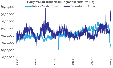 The ongoing attack by Houthis is forcing shipping vessels to divert to a much longer route around Africa’s Cape of Good Hope. As such, the daily transit trade volume in the Bab el-Mandeb Strait area has dropped by 59% (from 4990 th metric ton to 2040 th metric ton) since the attacks in Dec-23. In the meantime, the Cape of Good Hope has seen an increase in maritime activity by 38% (from 4328 th metric ton to 5964 th metric ton), which has helped to partially offset the overall drag on global maritime trade activity.