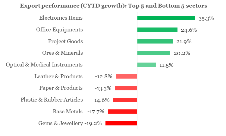Looking one level beneath the surface, we find that export of Electronic Items has so far had a fantastic performance in 2023 with a robust growth of 35.3% YoY (led by telecom instruments), while the Gems & Jewellery sector, with a contraction of 19.2% YoY (primarily on account of pearls and other precious/semi-precious stones), bore the maximum brunt.