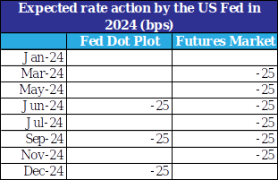 We continue to believe that the likelihood of an early reversal of the rate tightening cycle by the Fed is relatively low on account of residual inflationary pressures amidst slower than anticipated loss of growth momentum. As such, we continue to expect the Fed to start its rate cutting cycle from Jun-24 onwards.