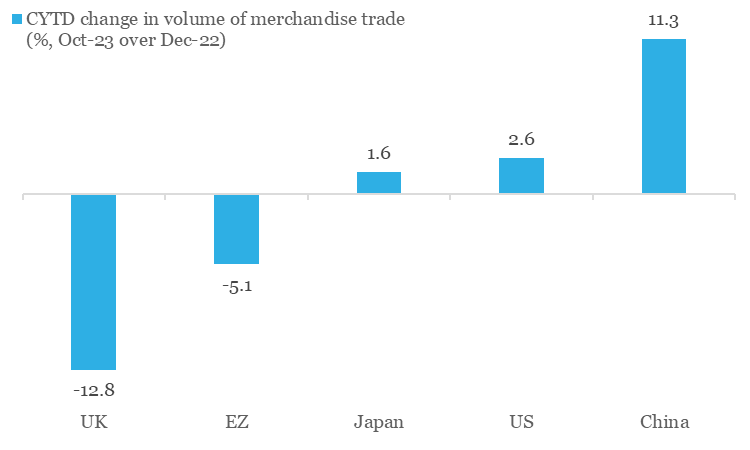 Chart 1: Among key economies, Eurozone and UK seem to have borne the brunt of trade slowdown in 2023