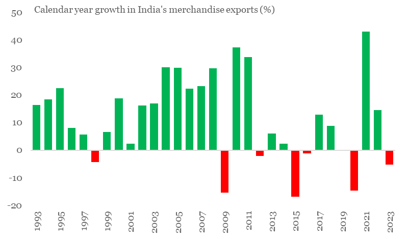 For India, 2023 has been dismal for exporters, with cumulative exports seeing a ~5% contraction (data available until Nov-23) in value terms over 2022. A cursory glance at India’s headline export performance since 2009 reveals a higher frequency of contraction compared to the earlier period. The 15-year period between 1994-2008 saw just one year of export contraction for India. In contrast, the 15-year period between 2009-2023 saw seven episodes of contraction in India’s exports – that’s almost 47% of the time! Rise of trade protectionism and shortening of global business cycle since the 2008 Global Financial Crisis (besides one-off factors like COVID) appear to have significantly weighed on external trade sentiment.